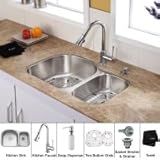 Undermount Double Bowl Kitchen Sink with Chrome Faucet and Soap Dispenser. KBU23-KPF1650-KSD30CH Features: -Number of holes: 4.-Add an elegant touch to your kitchen with unique Kraus kitchen combo.-Padded and stone guard undercoated insulation over a rubber pad reduces noise while sink is in use.-Certified and Listed by UPC, cUPC, CSA, IAPMO, ANSI and SCC.-Fits 33 inches cabinet.-Features dual pull-out spray head with an aerated flow or a powerful spray.-Spring-tensioned retractable hose.-Spout swivels 180-degrees.-Contains Sedal drip-free ceramic cartridge.-Hermetically sealed with adjustable temperature and flow rate limitation.-Single-lever water and temperature control.-Single-hole, top-mount installation.-Water pressure tested for industry standard.-Standard US plumbing connections.-2.2 GPM flow rate.-Installation in a 1.375-inch hole.-ADA compliant.-Spout reach: 7.9 inches.-Easy-push, self-priming pump.-Swivels 360 degrees.-Refillable from above.-Holds 14 ounces of liquid.-Requires 1.25-inch hole.-Measures 2.1 inches high x 3.5 inches deep. Includes: -Set of stainless steel bottom grids with protective feet and bumpers, stainless steel basket strainer, stainless steel strainer and dish towel are included.-Mounting and installation brackets, cutout template are included.-All mounting hardware and hot/cold waterlines are included. Construction: -Kraus kitchen sink boasts 16-gauge premium grade T-304 stainless steel construction with an 18/10 chromium/nickel composition.-Faucet is constructed from solid brass with stunning triple plated chrome finish.-Soap Dispenser is constructed from solid brass with stunning triple plated chrome finish. Color/Finish: -Scratch-resistant commercial-grade premium satin finish. Specifications: -Bowl sizes: 9 inches H x 18.5 inches W x 17.75 inches L.-Bowl sizes: 7 inches H x 16 inches W x 10.5 inches L.-Overall sizes: 9 inches H x 20.5 inches W x 31.5 inches L. Dimensions: -Faucet height: 15.5 inches.-Spout height: 8.1 inches. Collection: -Kitchen Combo collection. Warranty: -Manufacturer provides limit