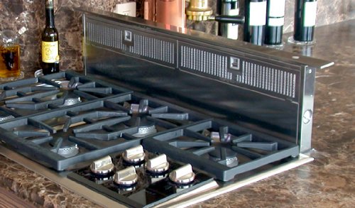 The Scirocco downdraft hood is perfect for island installations, where a canopy range hood is obstructive. Rising a full 8 1/4" above the cooktop, the Scirocco vents across the cooktop and down through the vent. At the press of a button, the Scirocco retracts back down into the counter.