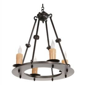 #The Nova Collection offers unique design with an old world feel which is easily adapts to other environments as well. At 20" in diameter, this piece works well in small spaces or in extra large spaces with several hung together. Alternately, you could surround a large centrally suspended Nova 8 or 12 light chandelier with several smaller units for a fantastically dramatic visual. While this piece ships with a foot of chain and a ceiling mounting plate, additional chain is available in 12" increments. Drip candles are available in amber and ivory.Specifications Dimensions: 20" x 20" x 25" high Iron Finish Options: Click here to view Iron Accent: Gold or Copper Accent Electrical: 60 watts max per bulb. Candle Color: Amber and IvoryAdditional InformationMade in America