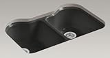 Kohler K-5818-5U-FP Caviar Hartland Hartland 28-1/4" Double Basin Under-Mount Enameled Cast-Iron Kitchen Sink K-5818-5U. Product Features:Double basin sink with a 50/50 split provides increased versatility for any taskCovered under Kohler s limited lifetime warrantyThe unique scalloped design of this Hartland sink adds a distinctive accent to a wide variety of kitchen styles from traditional to contemporaryTwo equally sized basins with a graduated rim offer ample workspace for a range of tasksConstructed of enameled cast-iron which combines strength, durability and insulation benefitsUndermount installation gives an integrated graceful look to the sinkRear drain location increases workspace area in the sink as well as storage area underneathAll hardware needed for installation includedProduct Technologies / Benefits:Enameled Cast-Iron: Kohler Enameled Cast-Iron combines the strength, durability, and insulation benefits of cast-iron with the scratch, chip, and burn resistance of a baked, powder coat finish and comes with an exceptional Lifetime Limited Warranty. When these materials are combined it gives the sink or tub the strength to last a lifetime of use. Kohler Enameled Cast-Iron is also available in a wide variety of specialty colors allowing you to truly customize your home.Product Specifications:Height: 9-5/8" (measured from the bottom of the sink to the top most point of the sink)Overall Width: 22" (measured from the back outer rim to the front outer rim)Overall Length: 33" (measured from the left outer rim to the right outer rim)Basin Width: 16-1/4" (measured from the back inner rim to the front inner rim)Basin Length: 14-1/8" (measured from the left inner rim to the right inner rim)Basin Depth: 9" (measured from center of the basin to the rim)Installation Type: UndermountNumber of Faucet Holes: 5Drain Outlet Connection: 3-7/