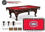 Montreal Canadiens 8' Pool Table - Traditional MahoganyDon't miss out on this American made custom pool table. Free installation by a professional installer is included. This is the 8' Traditional Mahogany version. Leg choices are shown above. We will contact you after the purchase to receive your leg choice. This officially licensed pool table features the team name on the apron. This table is hand crafted for Holland Bar Stool Co. by Olhausen MFG., one of the premiere billiard manufacturers in the world. Table has a 1.5'' thick 100% solid hardwood frame. The top rails, aprons, and legs are made from hand selected solid Maple. Finish is hand rubbed to accentuate the fine qualities of the Maple giving you a beautiful, durable and long lasting table. Logo and lettering are detail-engraved into the wood. Playing surface is made with a 1'' thick slate top. Surface is covered with a 21 oz. 80-20 blended wool billiard cloth made by Hainsworth of England. Logo is applied to the cloth using Hainsworth's patented technique, ensuring that gameplay is never compromised. Made in the USA with a Limited Lifetime Warranty on table frame. Dimensions: Assembled size (LxW): 96"x48". Assembled weight: 450 lbs.